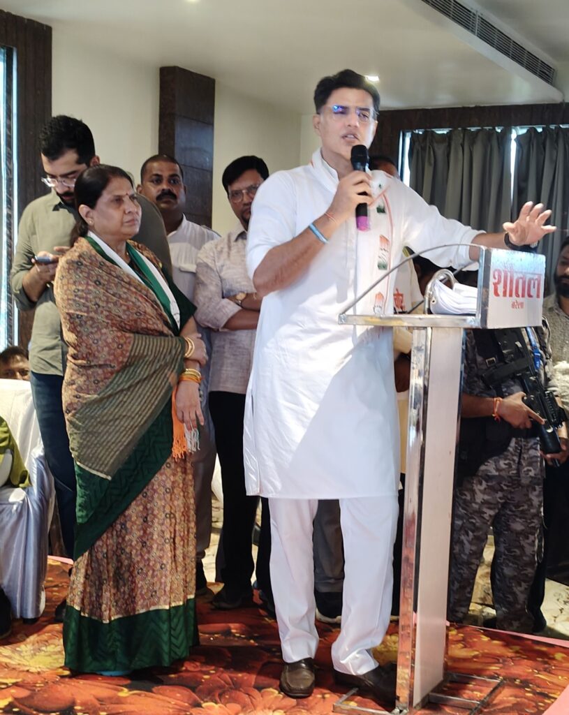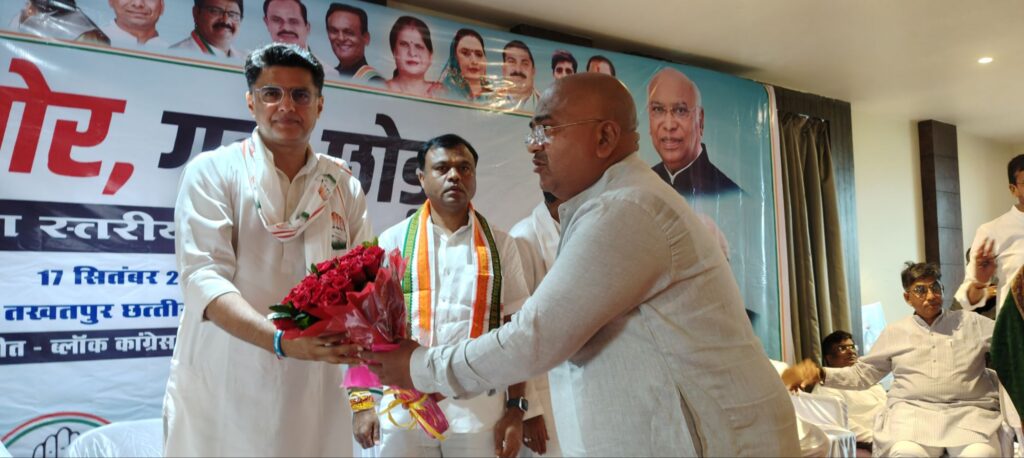 नगरपालिका अध्यक्ष ने किया भव्य स्वागत_ सचिन पायलट सहित अन्य वरिष्ठ कांग्रेसी नेताओं के नगर पहुंचने पर नगरपालिका अध्यक्ष पूजा मक्कड़ एवं आतमजीत सिंह मक्कड़ ने गर्मजोशी के साथ स्वागत किया। इस स्वागत में सभी को बड़ा गजहार क्रेन के माध्यम से पहनाया गया वहीं छत्तीसगढ़ की संस्कृति की झलक दिखाने वाली विभिन्न टोलियों के माध्यम से भी बाजे गाजे के साथ स्वागत किया और सभी वरिष्ठ कांग्रेसनेता उनके निवास में भोजन किए।